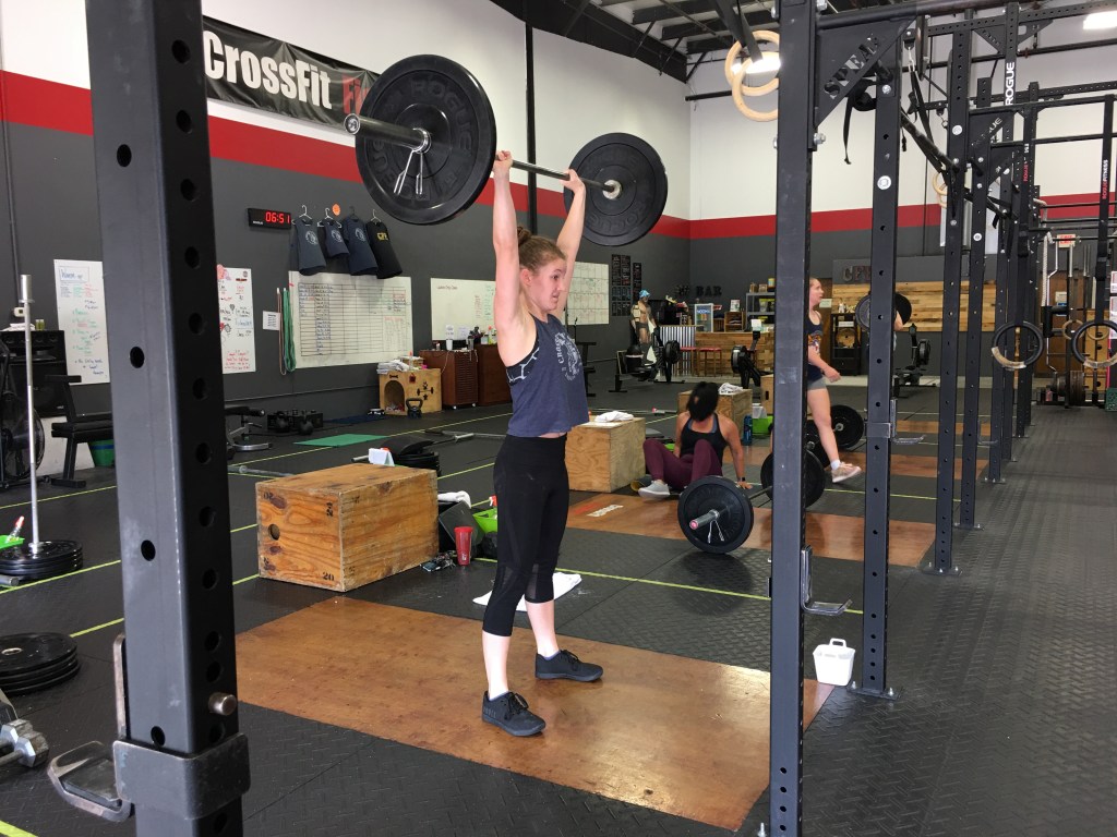 AMRAP 18 mins8 back squats 95/65 games style8 burpee step ups16 box dips16 sit-ups200 m run